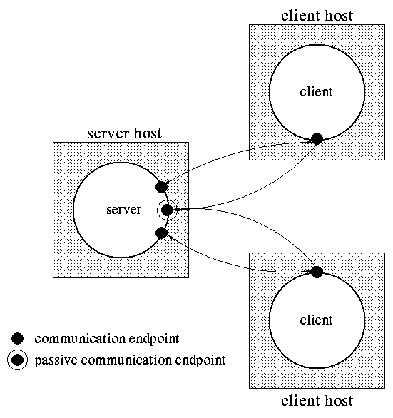 Figure 18.3 (page 613): Many clients can request connections to the same communication endpoint.