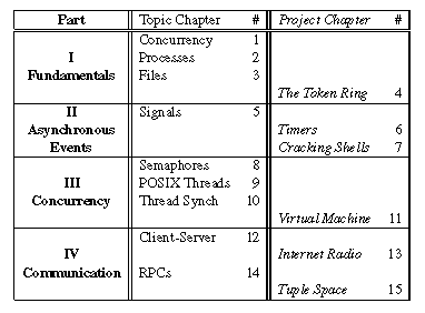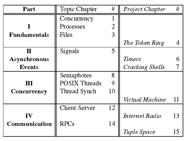 The book is organized into four parts, each of which contains topic chapters and project chapters. A topic chapter covers the specified material in a work-along fashion. The topic chapters have many examples and short exercises of the form "try this" or "what happens if." The topic chapters close with one or more exercise sections. The book provides programming exercises for many fundamental concepts in process management, concurrency, and communication. These programming exercises satisfy the same need as do laboratory experiments in a traditional science course. It is necessary to use the concepts in order to understand them fully. Exercises are specified for step-by-step development and most can be implemented in under 100 lines of code.