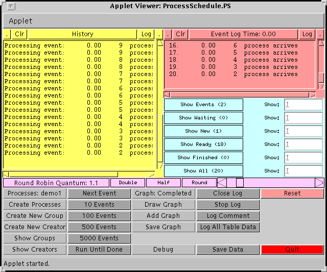 The applet allows the user to create processes with fairly general properties. Total running time, cpu burst time, I/O burst times, and interarrival times can be chosen from constant, uniform, or exponential distributions.