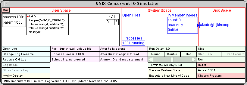 The screen is divided into sections. The top part of the screen shows a pictorial representation of the computer system. The bottom part has a collection of clickable buttons and other controls that modify the simulator properties and run the simulation. The top part of the screen is divided into three sections. These sections, from left to right are the User Space which shows the processes and threads, the System Space which shows the system open file table, the in-memory inodes and the list of processes, and the Disk Space which shows the disk blocks.