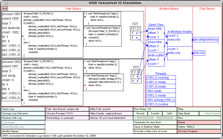 Figure 2 shows the simulator with a more complicated program after it has been executing for a while. There are now two processes, the first having 3 additional threads and the second having 2 additional threads. The User Space is divided into two regions, one for each process. For each process, the box on the far left shows the ID of the process and its parent, as well as the values of variables.